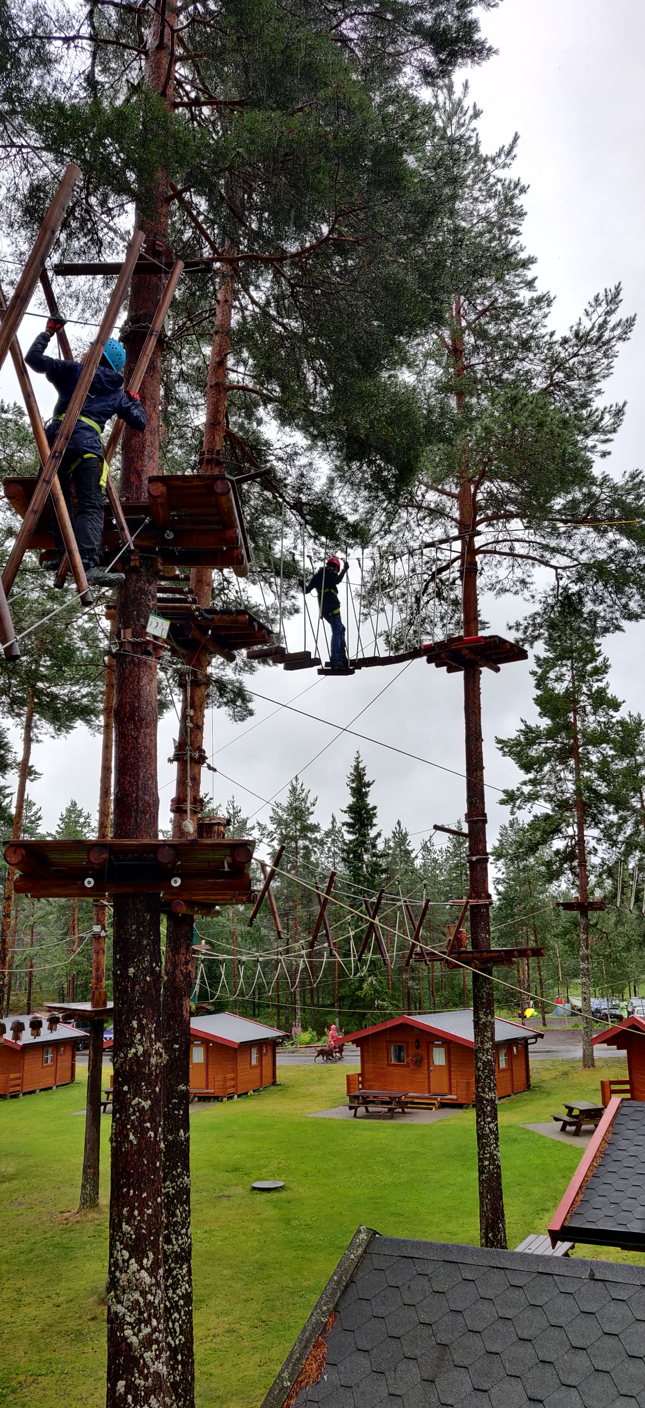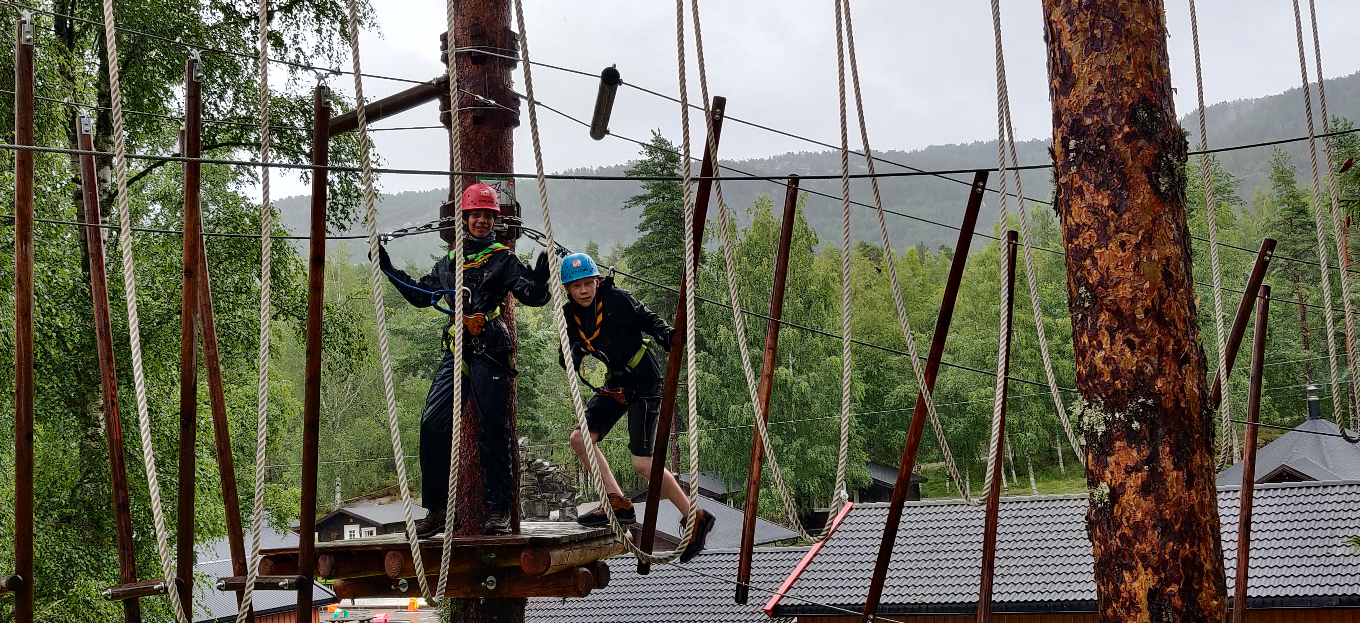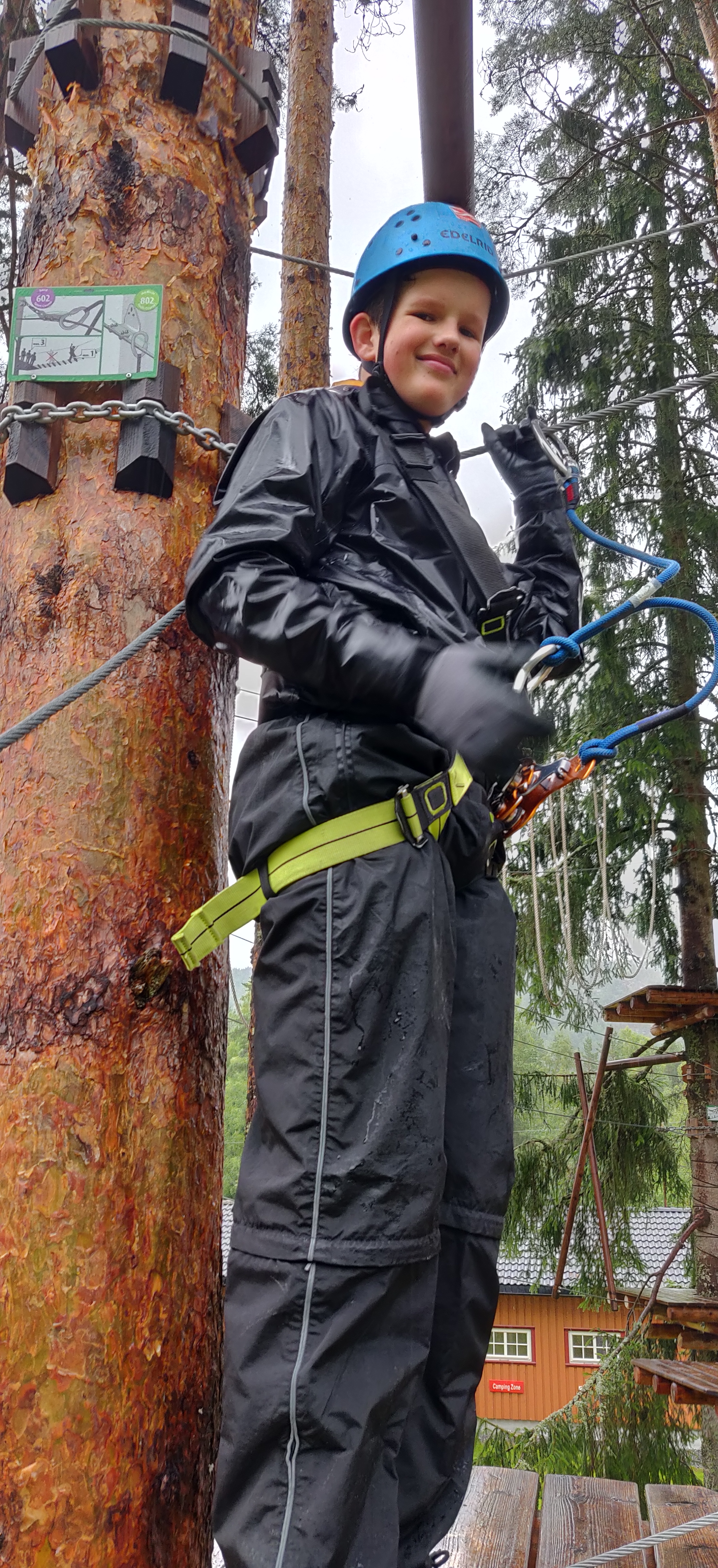 Søndag startede vi med træklatring, der var 5 baner i stigende sværhedsgrad. med den sidste så svær at det fik troplederne til at genoverveje den gode ide i at kaste sig ud i det. banen sluttede med et 12 m fritfald hop.