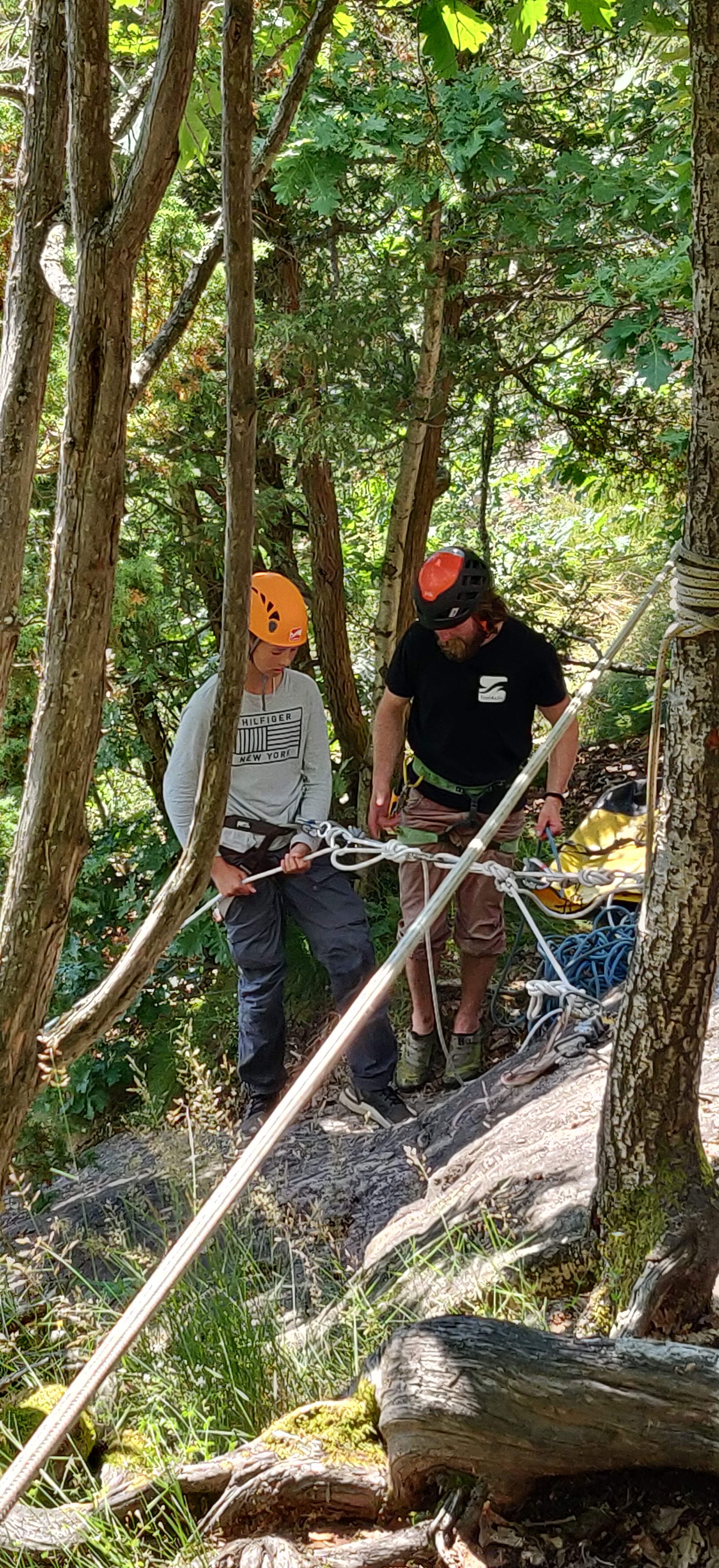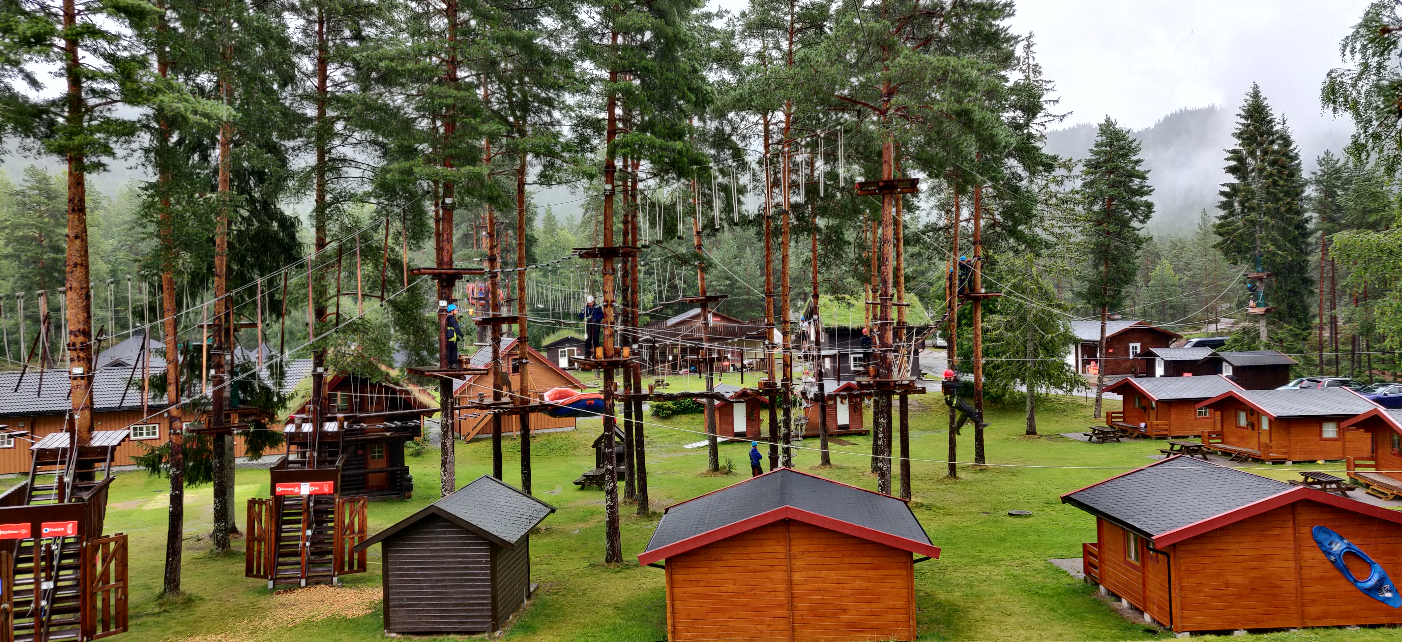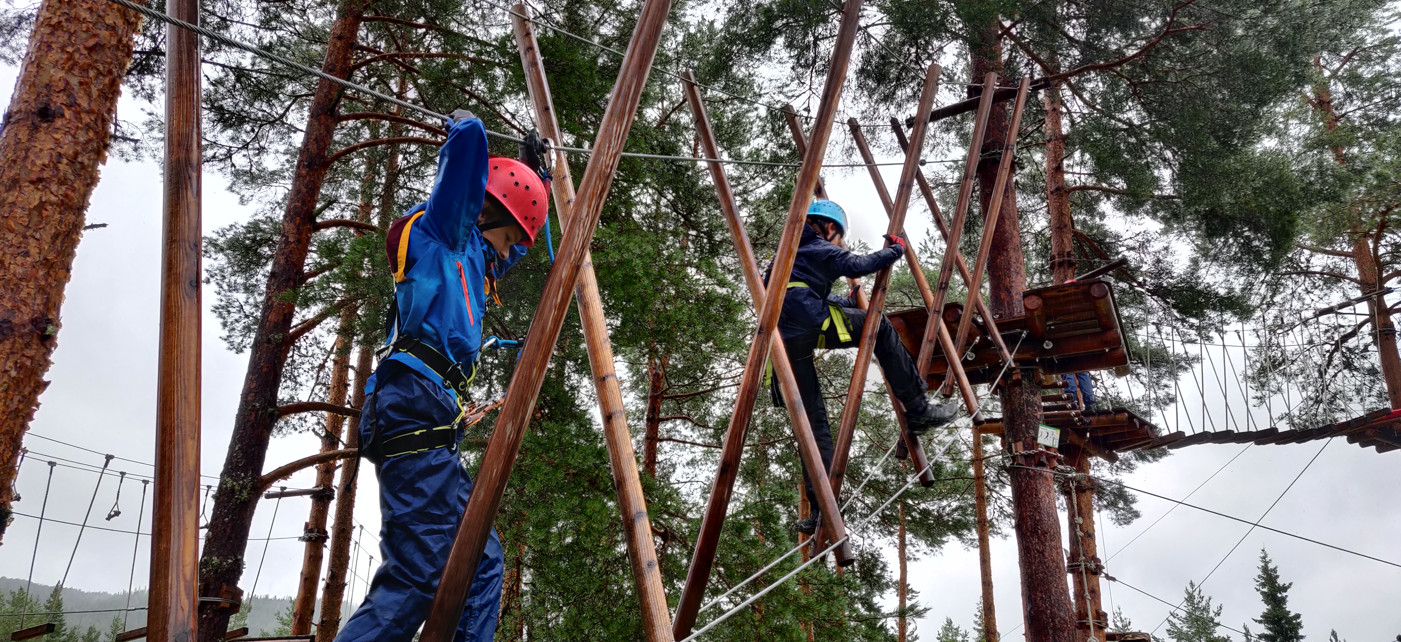 Søndag startede vi med træklatring, der var 5 baner i stigende sværhedsgrad. med den sidste så svær at det fik troplederne til at genoverveje den gode ide i at kaste sig ud i det. banen sluttede med et 12 m fritfald hop.