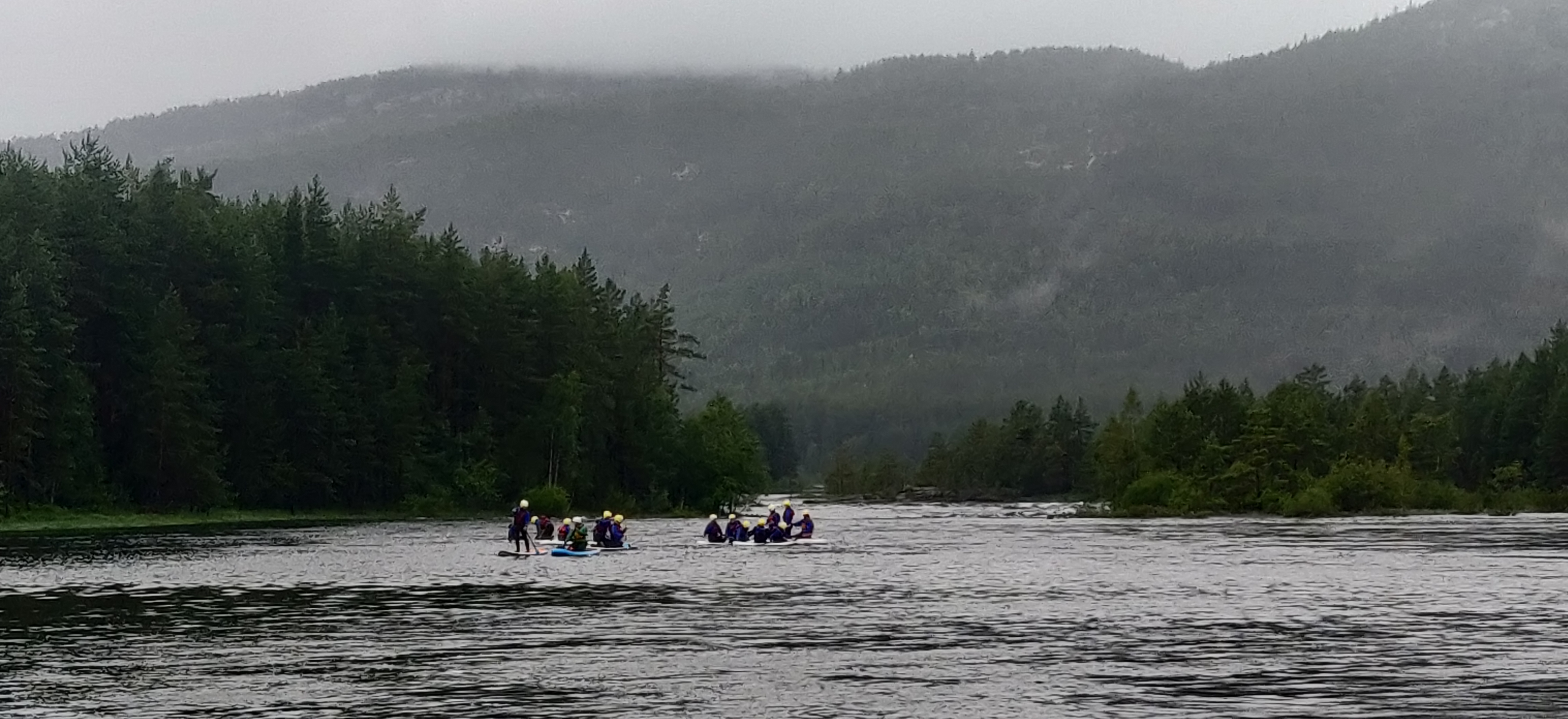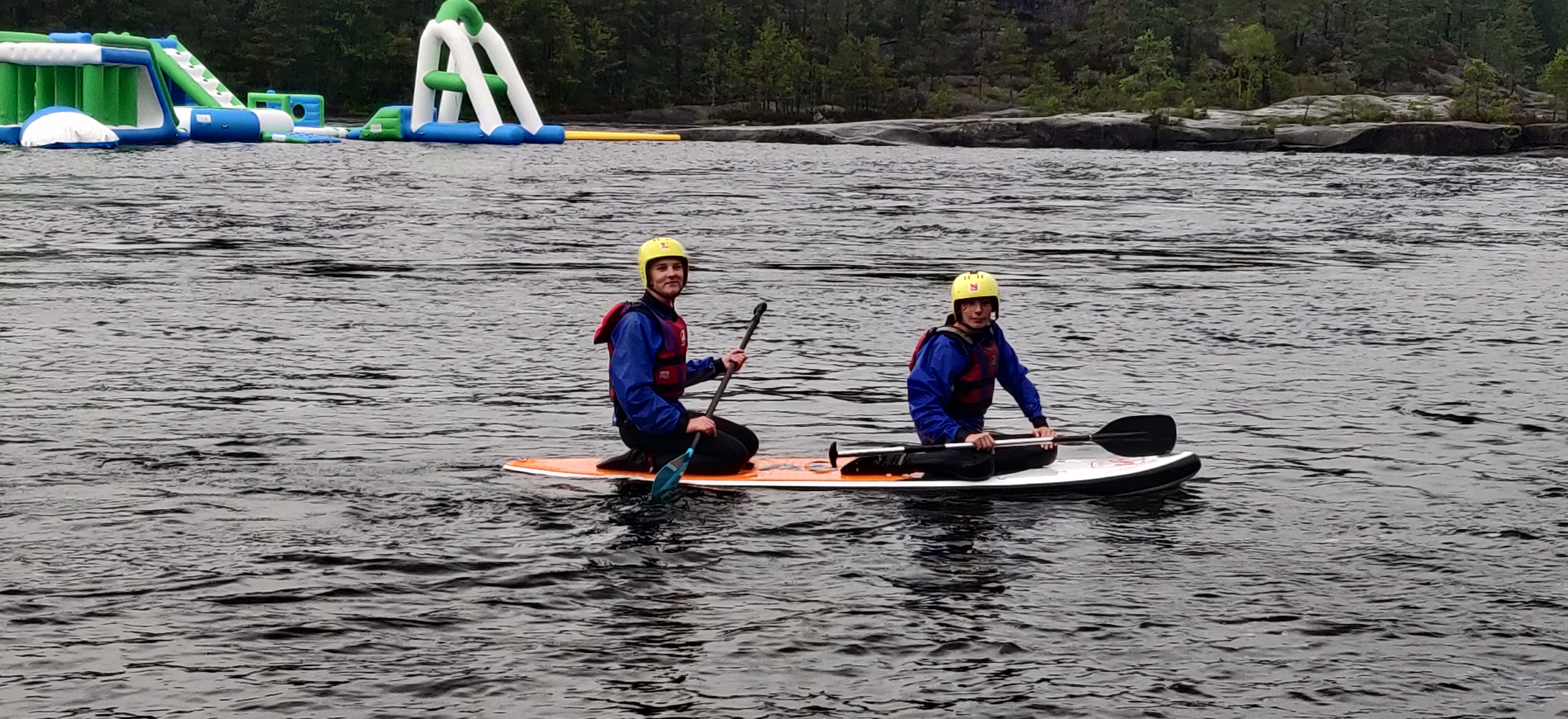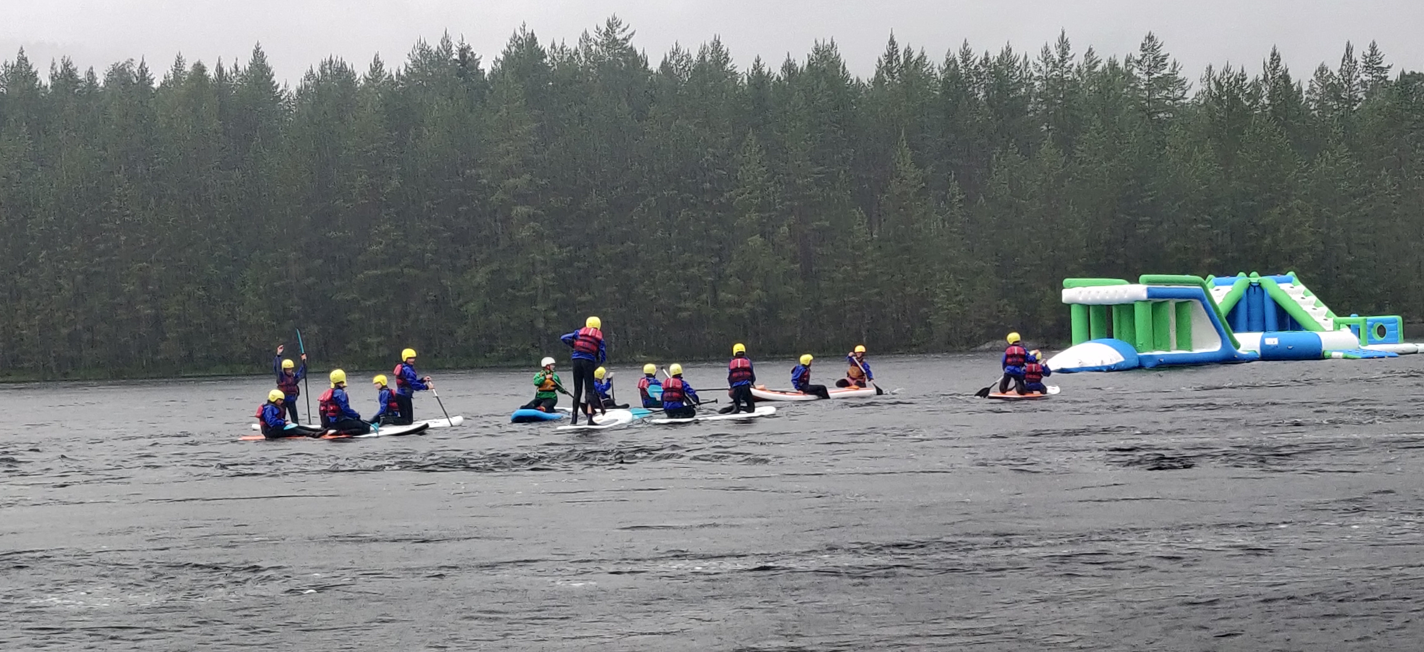 Efter en lang frokostpause i ly for regnen stod den på vandpark og paddle boards. udstyret med våddragt, vådsko, hjelm og redningsvest padlede vi ud til vandparken og i silende regn morede vi os med forhindringsbaner, rutchebane, hoppepude og trampolin ude på vandet.
