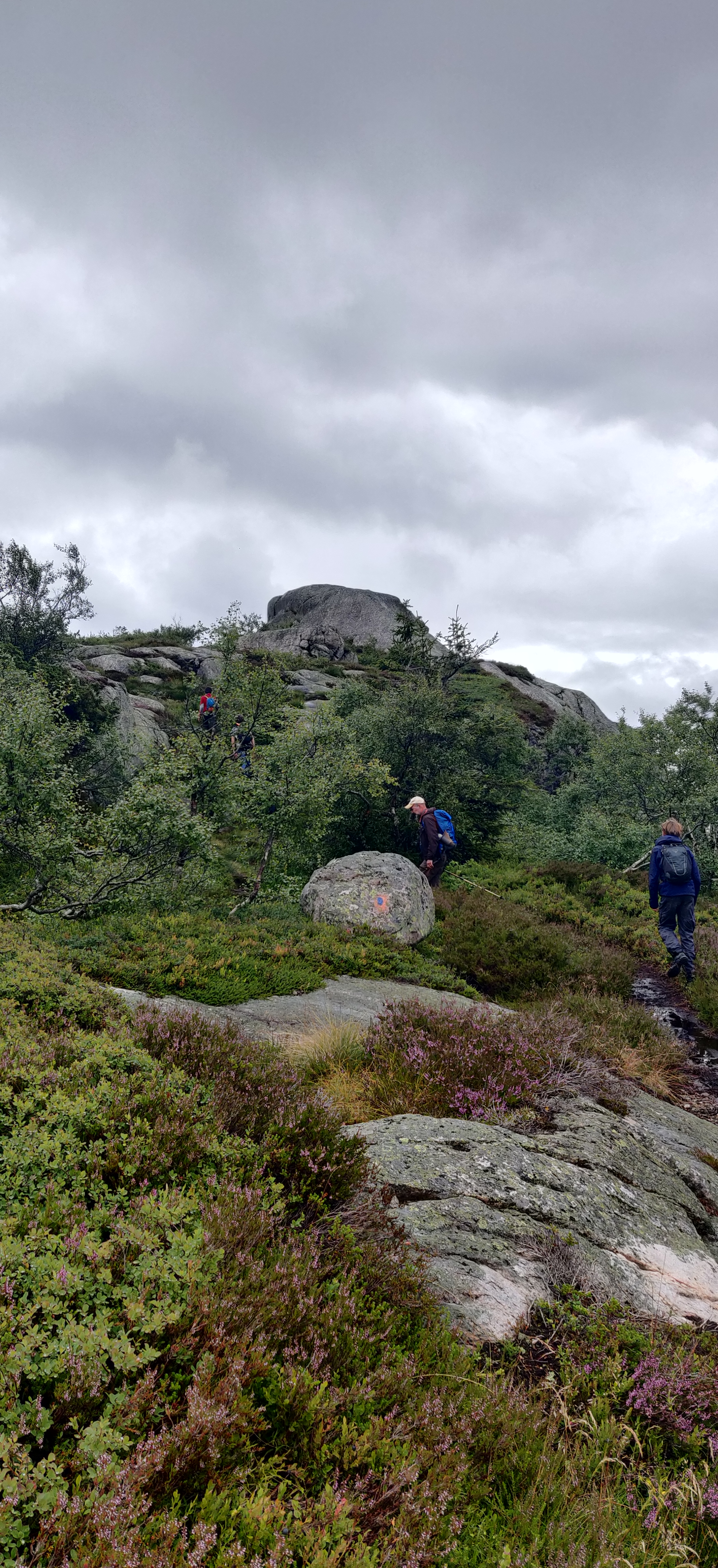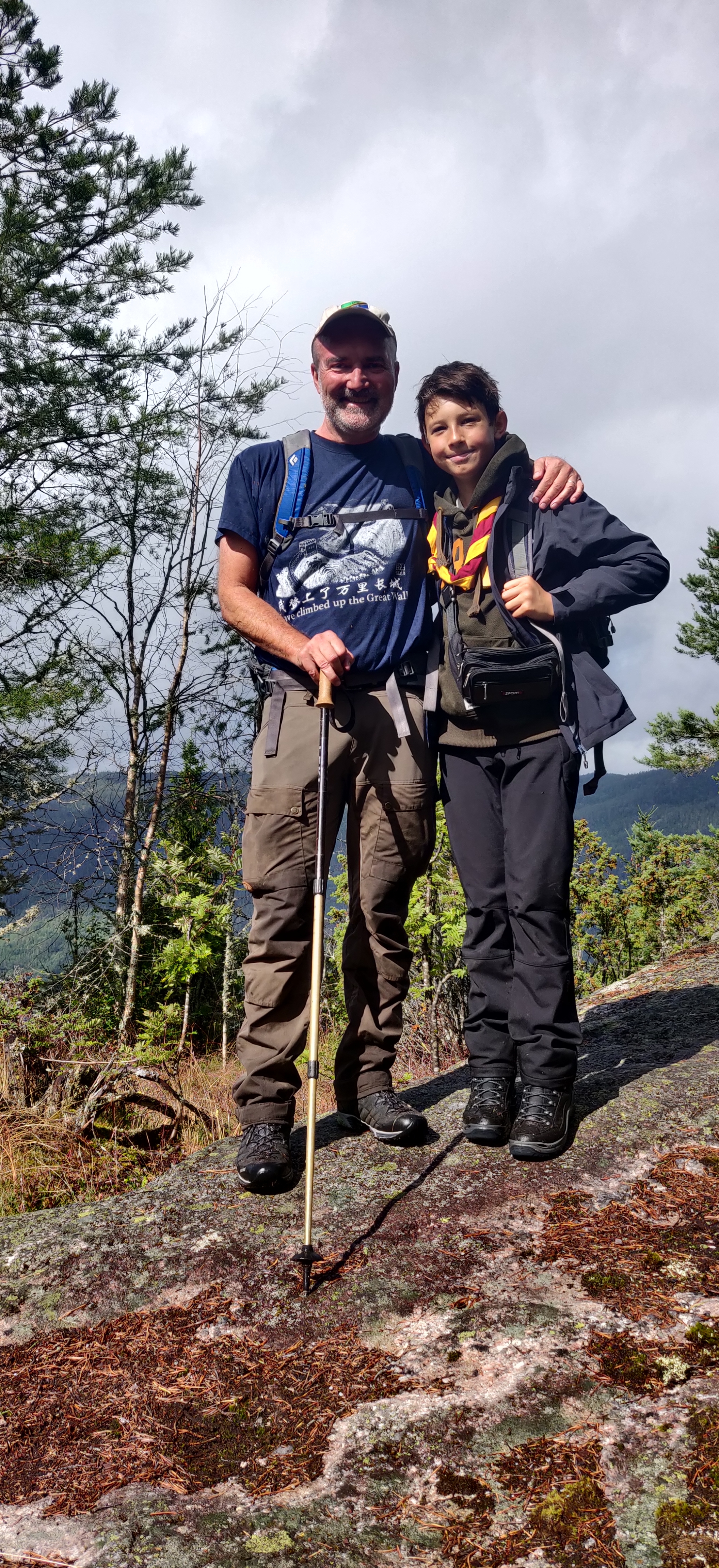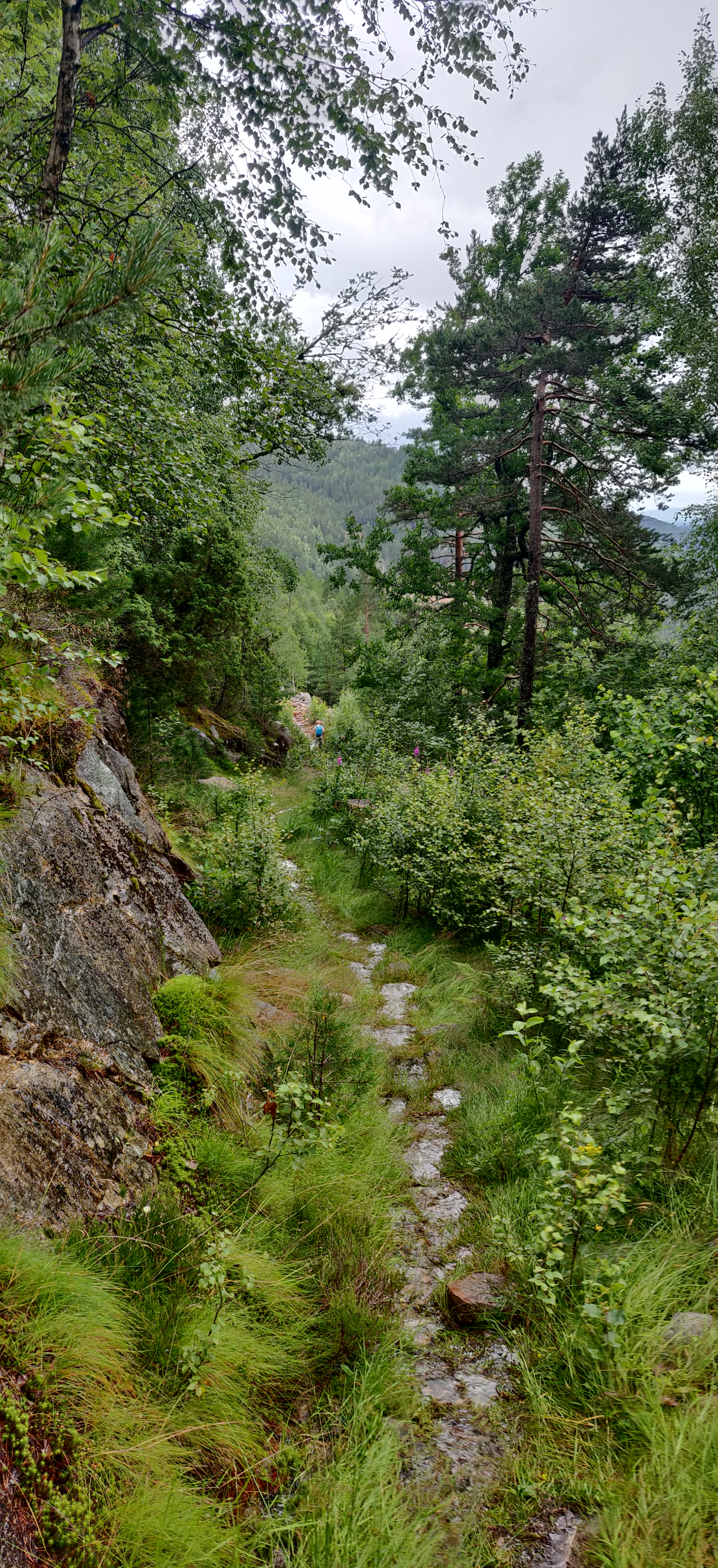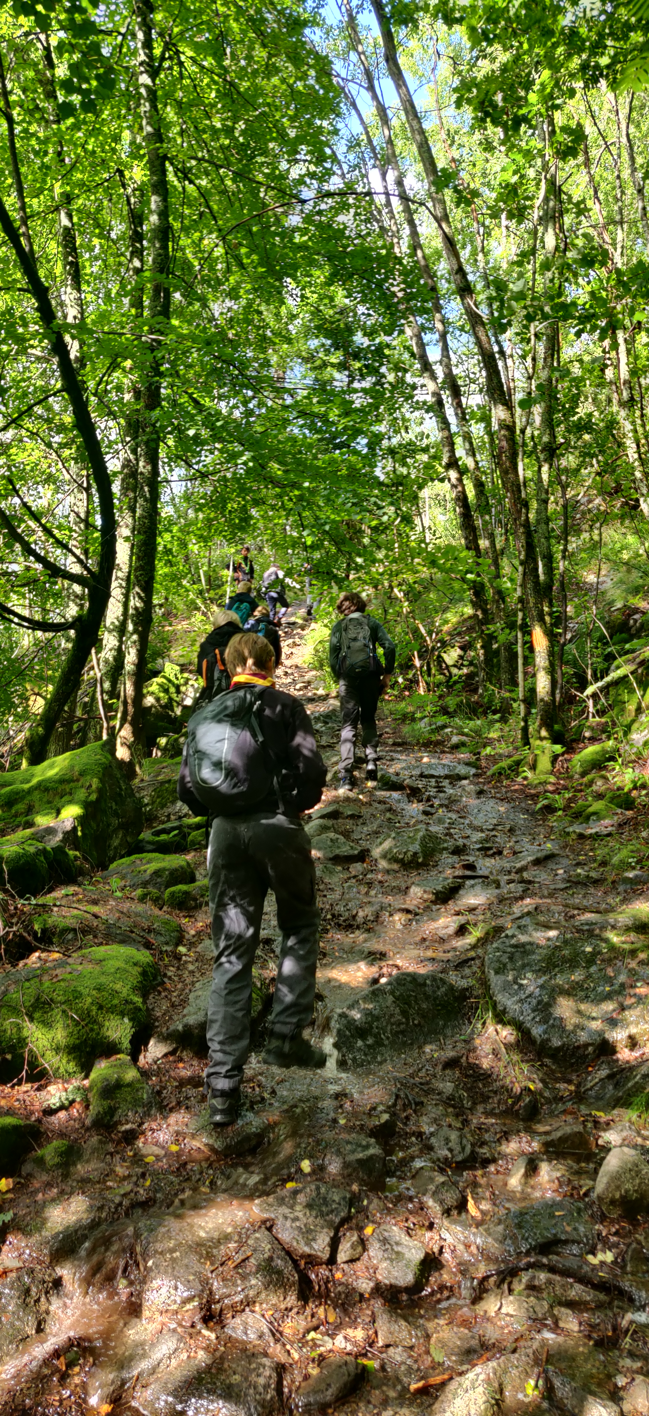 Da vi nåede til foden af fjeldet var sporet forvandlet til en lille bæk, da regnvandet forsat var på vej ned efter de sidste dages voldsom regn. heldigvis var største delen af sporet klippe og ikke mudder. terrænnet var voldsomt skiftende fra gran, til løv og bregner. steder med flad grund og steder med klipper, man skulle klatre henover. det sidste stykke på vej mod toppen var helt nøgen og goldt. her greb blæsten godt fat i os. på Vej ned gik vi langs med en større strøm/vandfald så vi altid havde friske vandforsyninger.
