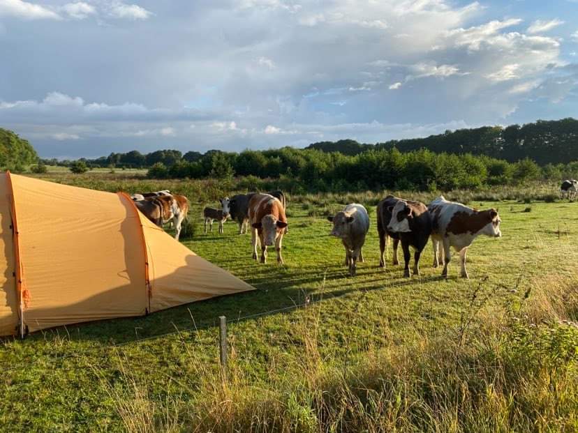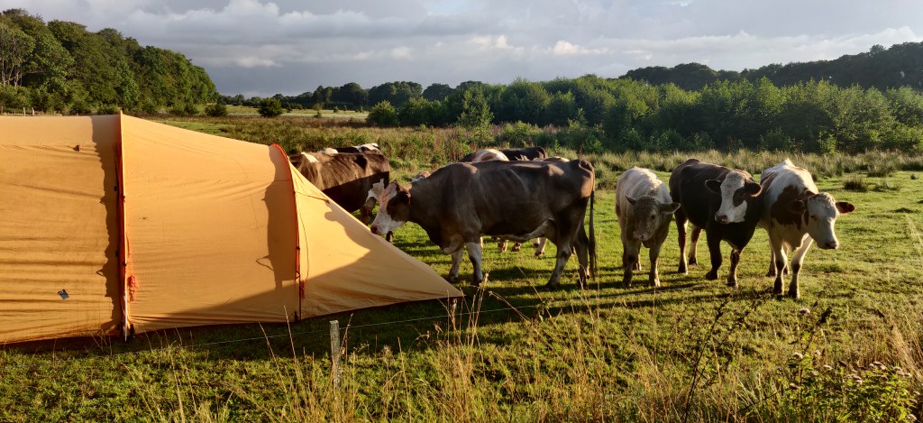 kl.7.00 var der morgenmad og taskerne var pakket sammen, tilbage manglede kun teltet. men mindt i morgenbrødet blev vi pludselig nervøse. for marken vi havde overnattet på var beboet af køer og kalve, de var nu på vej hen mod vores telt. fluks blev teltet tømt og døre lukket, for en ko skulle nødig blive fanget i teltet. 10 minutter senere var interessen for teltet væk og flokken med køer på vej videre. spændende var det dog!